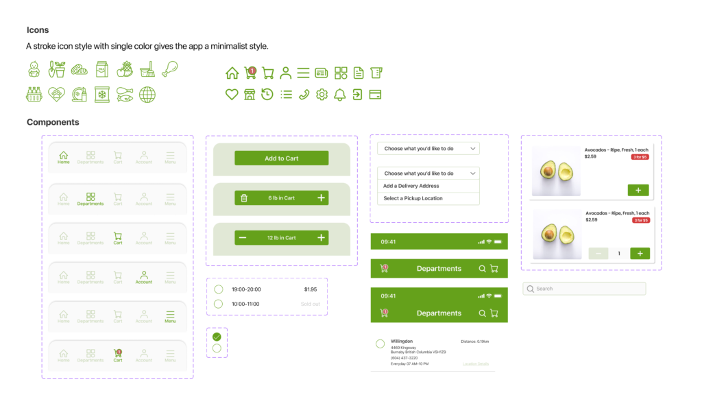The grocery app usually has colorful content, such as images and advertisements; therefore, I choose a flat and straightforward style with dual tone color from the branding color to redesign it. I want to give users a clean interface that will not quickly fatigue eyes. Also, the line height should be added to 1.5 height for the content portion to improve readability.