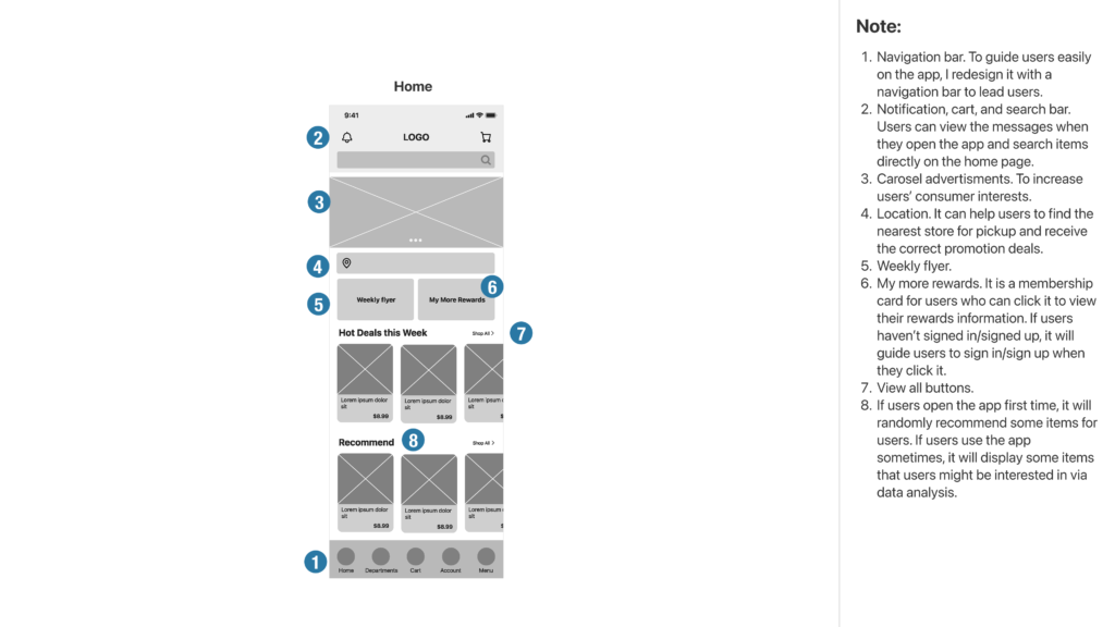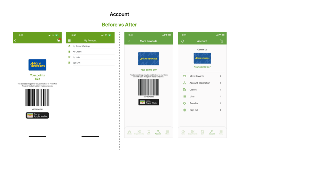 At a glance at the application, I realized it doesn’t have a navigation bar at the bottom to guide users through the app. It increases the steps for users to do online shopping on the app. I reviewed the feedback from the app store. Most users are unsatisfied with the online order for pick-up process. Also, most users care about reward points related to their accounts. Therefore, I would redesign the user flows and interface to solve the users’ problems.